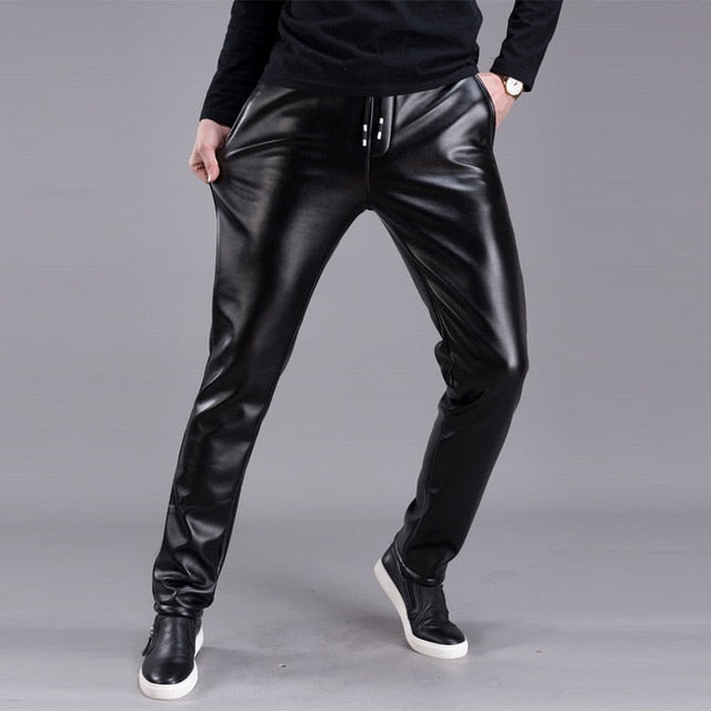 Spring Summer Men Leather Pants Elastic High Waist Lightweight Casual PU Leather Trousers Thin Causal Trousers